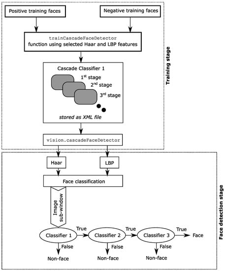 Figure 1 describes the flow of the proposed approach. In this design, Haar features are selected based on their usage at each stage [], and the training parameters were varied to obtain the best settings. To obtain a better trained cascade object detector result, the false-negative rate should be low in value (i.e., in between 0 to 1) so that more faces can be detected at the initial stages. Subsequent stages correct the mistakes of the previous ones, which give room for proper examination before marking an object as negative.