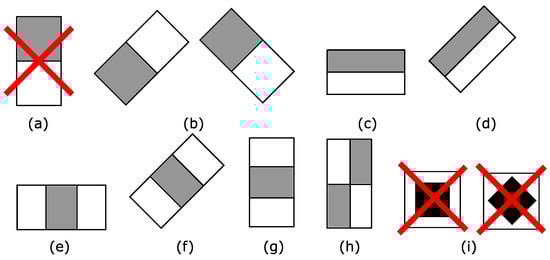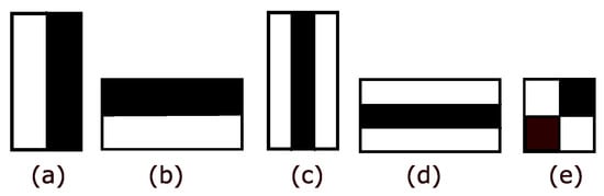 Haar has been a common feature employed by many researchers for object detection [,]. Viola–Jones used Haar-like rectangle features adapting the idea (from the work of Papageoriou et al. []) of using Haar-like wavelets. Figure 2 shows the examples of the rectangle Haar-like feature placed around the region of the image to detect faces. There are two-rectangle features (vertical and horizontal) as shown in Figure 2a,c, a three-rectangle feature in Figure 2e, and a single four-rectangle feature in Figure 2h. They are used to determine the common attributes of the face because the region of the eyes is believed to be darker than that of cheeks, while that of the nose is brighter. The sum of the pixels that lie within the white rectangle is subtracted from the sum of the pixels in the grey rectangle to determine the difference in the contrast region.