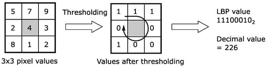 The pixels of an image are arranged in LBP format, that is, tagging each pixel with decimal numbers. The format is called Local Binary Patterns or LBP codes. LBP considers the neighborhood of each pixel by subtracting the value of the center pixel from its neighbors (8). If the resulting value obtained is a positive number, it is represented as 1, otherwise 0. This procedure will create binary numbers (zeros and ones), which can be combined starting from the top-left in a clockwise direction. The resulting binary numbers are referred to as the local binary patterns. The decimal value obtained after converting the LBP value serves as a label for the pixels. Figure 6 shows a local binary conversion of a neighborhood pixel.