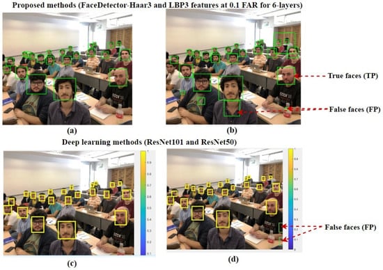 At eight layers of stages, the two trained face detectors were tested on different classroom image (i.e., Image II). It can be observed from Table 2 that, unlike for six layers of stages, the LBP detector has a higher TPR value than the corresponding Haar-like detector. Although the LBP detector has a higher number of true faces detected (TP), the number of non-faces (FP) detected is equally much, as shown in Figure 9. The performances of the deep learning versions (i.e., ResNet101 and ResNet50) are better than that of the Adaboost. However, the processing time advantage gives Adaboost algorithms an edge over deep learning, especially on low power devices (e.g., raspberry pie) online applications.