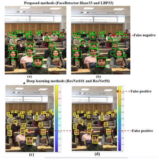 Each stage of the classifier in the cascade was trained with the 2651 (also of size 24 by 24 pixels) training faces, and 5302 negative samples using the Haar-like and LBP features, respectively. The trained face detectors’ performance is tested using different educational classroom database images obtained from a GitHub website (https://github.com/mackenney/attendance-system-wacv19/tree/master/DB). The analysis was carried out based on the number of faces detected (TP), the True faces that are not detected (FN), the False faces detected (FP), and the time taken to detect the faces (DT). The performance was tested in comparison with that of two pre-trained tiny faces (ResNet 101 and 50) deep learning face detector obtained from Finding Tiny Faces (cmu.edu) [] using classroom images with a resolution of and pixels, respectively.