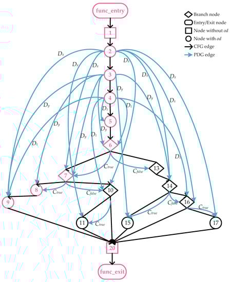 A program dependence graph (PDG) is a directed graph whose nodes represent program statements and whose edges represent data and control dependencies [19]. PDG can be expressed as . V represents the vertex which is statements and predicate expressions. E refers to the edge which represents data dependence and control dependence between vertexes. The edges in E may be partitioned into two graphs. Edges that represent data values on which a vertex depends form the data dependence graph (DDG). Edges that represent control conditions on which a vertex depends form the control dependence graph (CFG) [20].