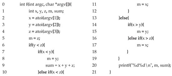 A candidate oracle data is composed of a variable and its observation position. According to the definition of oracle data, the observation position p is only at the assignment statement in the program, and the variable v is the assigned variable in the assignment statement. Because there may be data dependencies between assignment statements, the corresponding oracle data also have data dependency relations. Variables v in can not only be defined but also used. When v is used, the value of v propagates to a dependent variable. As a result, the corresponding to v can be substituted by dependent to detect faults. According to our investigation, the substitution capability of varies due to their different dependence relations. Take variables in the example function f in Figure 3 as an example. Line 2 is an assignment statement and contains candidate oracle data. Variable x is assigned by a function call. If x is assigned an erroneous value in line 2, this erroneous value will be propagated to other variables, for example, propagating to variable m in line 11. As a result, we can use to detect faults resulting from ; is substitutable. The substitution capability of candidate oracle data is determined by data dependence relations. If other oracle data that are dependent on and is not dependent on any oracle data, then has a strong capability to be substituted. We can use other oracle data to detect faults resulting from , and can be removed from the candidate oracle dataset. If is dependent on other oracle data, the substitution capability of will be weakened. This is because the value of the variable in is influenced by many other variables and is more likely to contain erroneous values; therefore, may be useful for detecting faults resulting from its dependence on oracle data. For example, in Figure 2, is data dependent on , and , and removing may miss the errors caused by , or .