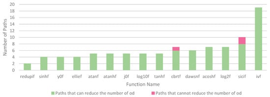 Figure 6 shows an overview of the effectiveness of quantity analysis. From the data in Figure 6, it is apparent that most of the paths can reduce the number of oracle data. However, there are still two functions that have paths that cannot reduce the number of oracle data by quantity analysis. We performed further analysis on cbrtf and sicif. The in-degree of some od in paths that cannot reduce the number of oracle data is equal to 0, and the out-degree is also equal to 0. This is because the variables in these od are used in branch statements rather than assignment statements (other od). As a result, the erroneous values in these od cannot propagate to other od. To avoid false negatives in subsequent analysis, we cannot put these od into rm_od. Therefore, we have paths that cannot reduce the number of oracle data.