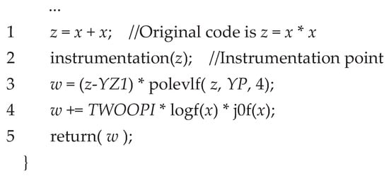 Table 4 presents the results of fault-detection rates. From the results in Table 4, it is apparent that both approaches can achieve good fault-detection rates. For some functions, such as sinhf, y0f and so on, PSODS-mutation testing can achieve better fault-detection rates. This is because erroneous values may not be propagated to output; they may vanish before they reach output variables. PSODS can selected oracle data from the program instead of just using the default output variable. In addition, PSODS ranks the selected oracle data according to their fault-detection capability. By observing the selected oracle data, PSODS may have more opportunities to find faults in the programs and achieve better fault-detection rates. Take the code fragment in y0f in Figure 7 as an example. A fault is injected in line 1. After the program executes line 1, variable z is assigned an erroneous value. The erroneous value can propagate to variable w. However, w is assigned a new value in line 4. Therefore, the erroneous value cannot propagate to line 5. The output-only approach cannot find this fault. In this example, z is one of the oracle data that is selected by PSODS. PSODS generates an instrumentation statement after line 1; as a result, erroneous value is collected and the fault can be found.
