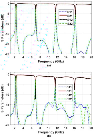 By applying Equations (14) and (15) described in Section 2.2, the loaded () and unloaded () quality factors of the four samples at different resonant frequencies can be calculated, which are shown in Figure 5a,b, respectively. As can be seen from the figure, the average values of and at resonance order 1 (), order 3 (), order 5 (), and order 7 () are 209.1 and 211.3, 193.5 and 206.9, 188.7 and 212.1, and 125.4 and 155.5, respectively. The of the UGPCW embedded resonator at order 1 reaches 211.3, which is higher than those of microstrip line-based quarter-wave stub resonators, half-wave line resonators, and ring resonators in the literature [8,13,19,20]. For the proposed UGCPW embedded resonator, high current density is mainly concentrated on the line edges, and the current located in the central embedded resonator stub is small, which helps to achieve the high Q value.