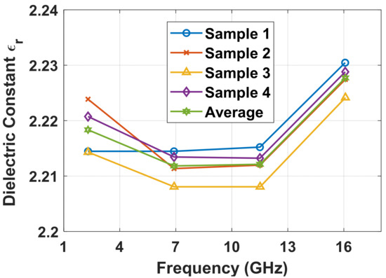 Table 1 lists the measured resonant frequencies and the corresponding insertion losses at these frequencies for the samples, as well as that of the simulation results for the proposed resonator. It proves that the proposed resonator resonates at odd integer multiples of its quarter wavelength frequency, as described in Equation (1). The data in this table also show that the frequency response measured by multiple samples is very close and has good consistency. It is also noticeable that the measured frequency responses are in good agreement with the simulation results. Based on the calculation method provided in Section 2.1, the extracted dielectric constant values of the samples at different resonant frequencies are set out in Figure 4, including their average dielectric constant at these frequencies. It can be seen from the figure that the dielectric constant values derived from the four samples have extremely small deviations at each resonant frequency. The average dielectric constants of the substrate at resonance order 1 (), order 3 (), order 5 (), and order 7 () are 2.218, 2.212, 2.212, and 2.227, respectively. The variations of the extracted dielectric constant of the four samples mainly come from the measurement, including the VNA noise, the cable stability, and the VNA calibration; all of these issues contribute to the difference of the measured S-parameters [29]. Another factor may be due to the fabrication tolerance, and it consists of the dimensional error and microwave connector repeatability of the samples. It can be observed from the extracted dielectric constant values that their differences are acceptable, and it can be reduced by averaging the values through multiple measurement. When comparing the dielectric constant ( at order 1 with that () given in the datasheet, the deviation of the dielectric constant value is only 0.018 (relatively 0.82%).