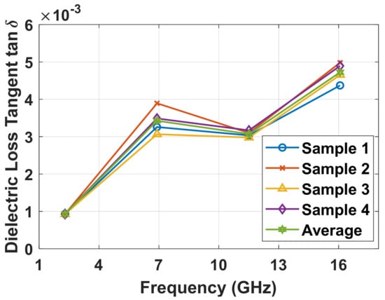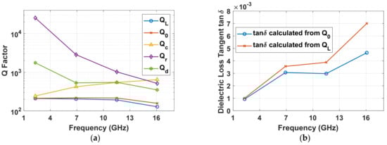 where and are the conductor quality factor and radiation quality factor, respectively. is the dielectric quality factor, which is related to the dielectric loss, so the dielectric loss tangent can be calculated by , as follows: