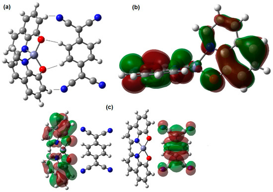 ZnQ2-TCNQ (a) optimized structure, (b) orbitals HOMO–LUMO of the formed complex, and (c) separated HOMO and LUMO functions. The last figures were taken from B3PW91/6-31G** calculations.
