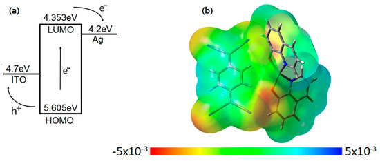There are other important factors that influence the transport properties of the compound inside the device, such as the dipole moment of the molecule, which, according to both DFT methods, is 8.81 Db. This high polarity indicates the heterogeneous charge distribution along the structure of ZnQ2-TCNQ generated by atoms, such as the oxygen of hydroxyquinoline and the nitrogen of TCNQ. In Figure 3b, the electrostatic potential mapped onto the electron density is apparent; the red zones represent the strong electronegative poles, one localized on the heterocyclic region of the hydroxyquinoline moiety and some discrete ones on the terminal nitrogen atoms of the TCNQ fragment. The important value of the dipole moment arises from the interaction between these regions, and those that are electropositive are shown in green-blue or blue colors.