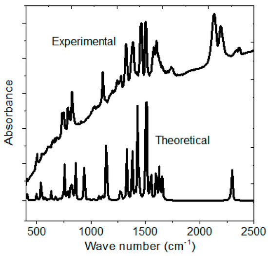 The results obtained from B3PW91/6-31G** calculations point to the feasibility of carrying out the experimental synthesis of the semiconductor ZnQ2-TCNQ. After the synthesis, the semiconductor was characterized in its main functional groups through IR spectroscopy. The IR spectrum was compared with those obtained theoretically, and they concur well; both spectra are shown in Figure 4. Notably, the theoretical B3PW91 and PBE spectra are similar, except for small shifts in the bands. Characterizing our experimental spectrum, with reference to our theoretical spectra, we found that the most intense characteristic peaks on the 400–600 cm−1 region can be shown to relate to the asymmetric stretching vibrations of metal ion with attached ligands. In the first zone of the 700–850 cm−1 band, we localized in-plane deformation vibrations of both TCNQ and ZnQ2, whereas the next section in this band is totally dominated by wagging and torsional vibrations in Q2. The band at 1100–1200 cm−1 corresponds to scissors of H atoms. In the bands in the 1260–1700 cm−1 zone, alternating vibrations were identified in TCNQ or hydroxyquinoline, although in general, the most intense vibrations are associated with the last molecule. The TCNQ signal is observed at 2192 cm−1, which refers to the CN stretching mode of the cyano groups. The main differences between the theoretical and experimental spectra are due to the presence of TCNQ moiety; the corresponding changes are found in the region between 2070 cm−1 and 2380 cm−1. These signals are related to the C-H vibrations of TCNQ, which may be in excess. Note that a more detailed analysis is presented in Table 2. It is apparent that, generally, our description concurs well with previous descriptions in the literature [11,37,38,39,40,41]. Thus, the good agreement between the experimental IR spectrum and those obtained theoretically indicates that these calculations constitute an effective approach to this experimental study. Subsequently, the optimized structures in Figure 2 will be used in the subsequent evaluation of the optoelectronic properties of ZnQ2-TCNQ.