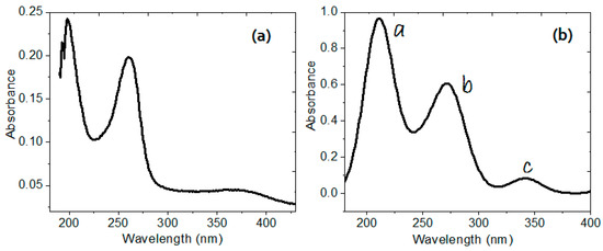The UV–VIS absorption in the organic semiconductor was evaluated theoretically and experimentally in a thin film over quartz, and the spectra obtained are shown in Figure 6. The ZnQ2-TCNQ film exhibits an ultraviolet absorption peak in the range of 200–400 nm (Figure 6a). The absorption spectrum is dominated by intense absorption bands at 198 nm, 261 nm, and 367 nm. Theoretically, these bands are located at 211 nm, 272 nm, and 340 nm (see Figure 6b). According to our TDDFT calculations, the band a at 198 and 211 nm (experimental and theoretical, respectively) mainly consists of five singlet–singlet electronic transitions, the strongest one corresponding to metal-centered charge transfer, the other two mainly related to intramolecular charge transfer in hydroxyquinoline, while the two most energetic ones relate to the electronic interchange between the ZnQ2 and TCNQ species. In Table S2, the parameters characterizing these electronic transitions (energy, oscillator strength, molecular electronic transition, and weight of the electronic transition) are presented, and in Figure S1, the molecular orbitals involved in each of these are schematized. Next, the strongest electronic transitions in the absorption band b, observed at 261 and 272 nm (experimental and theoretical, respectively), mainly relate to HOMO − 1→ LUMO + 1, HOMO − 5 → LUMO + 2, and HOMO − 6 → LUMO + 1 transitions, which again represent intramolecular charge transfer in hydroxyquinoline. Interestingly, in this band we also found some less strong electronic transitions that can be assumed to represent metal-to-ligand charge transfer state (i.e., from the zinc ion to the 8HQ molecule (e.g., the electronic transitions at 266.34, 265.43, and 261.95 nm in Table S2)); we recognize that this type of transition has already been reported [10] and clearly shows π–π* as it was found in experimental and theoretical fashion [44]. Finally, the lower energy band c, at 367 and 340 nm (experimental and theoretical, respectively), is characteristic of hydroxyquinoline, as shown in Figure S1, involving singlet–singlet (HOMO, HOMO − 1) → LUMO + 6 and (HOMO, HOMO − 1) → LUMO + 5 transitions, all of which correspond to intramolecular charge transfer in hydroxyquinoline, which concurs well with previous descriptions [45,46,47,48]. The differences between the experimental and theoretical spectra are related to the displacement of the three bands in the experimental spectrum with respect to the theoretical one. This differences can be attributed to several factors. First, the experimental values can vary due to the film rugosity, crystallinity, morphology [49], and so forth. Furthermore, the comparison between a single molecule (theoretical result) and a solid state (experimental result) is expected to involve substantial differences.