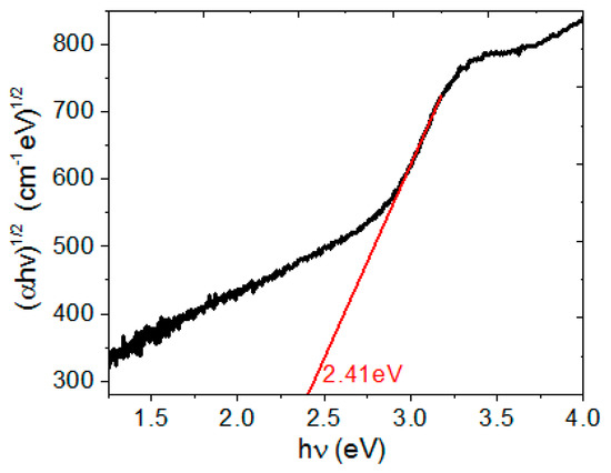 Information about interband transitions and optical activation energy in our sample was determined with reference to the analysis of the UV–VIS spectral dependence of the absorption near the fundamental absorption edges within the framework of a single electron theory [12,50]. The optical activation energy, also known as the optical gap (Eopt) associated with the semiconductor films, is determined through an extrapolation of the straight-line graphs to zero absorption observed in the spectral dependence of (αhν)1/2 over a limited range of photon energies (hν) (see Figure 7) [51]. The absorption coefficient (α) and frequency (ν) are experimentally obtained from the UV–VIS spectrum and the thickness of the film, while h is Planck’s constant. The coefficient α near the band edge shows an exponential dependence on photon energy, which usually obeys the Urbach relation , and ½ is a number characterizing the transition process in amorphous semiconductors [51,52]. The optical electronic transitions in the film ZnQ2-TCNQ are of the indirect type, which is characteristic of amorphous films obtained by the high vacuum evaporation process used in this work. When radiation falls on the film, during the UV–VIS spectroscopy, a photon is absorbed by an electron in the HOMO, which is localized in ZnQ2 and moves to the LUMO that is found in the TCNQ moiety. During the transition, besides the absorption of a photon, the exchange of a phonon is also produced, changing the electron wave vector [52]. For these indirect transitions, the obtained Eopt is 2.41 eV, and considering the energy difference of the HOMO and LUMO orbitals recorded in Table 1, the HOMO–LUMO gap has a value of 1.52 eV and is smaller than Eopt. Eopt depends on the structural factors of the material, such as the alternation in bond length, nature of the films, presence of impurities resulting from the doping process, and degree of stacking of the electron donor and acceptor molecules [5]. Conversely, the theoretical bandgap does not consider external effects on the semiconductor molecules, hence the difference in its values with respect to Eopt.