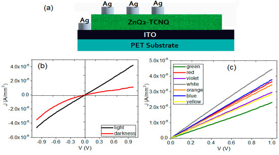 In order to evaluate the capacity of ZnQ2-TCNQ as a photoactive layer, we manufactured a flexible device, PET/ITO/ZnQ2-TCNQ/Ag (Figure 8a), that follows the operation described in the energy scheme in Figure 3a. According to the energy scheme, the electron injection barrier between Ag and ZnQ2-TCNQ is 0.153 eV, and the hollow injection barrier between ZnQ2-TCNQ and ITO is 0.905 eV. From the above results, it can be deduced that in the device, the extraction of electrons at the cathode (Ag) will be more efficient than the extraction of holes at the anode (ITO). On the side of the active layer, which is responsible for the absorption of radiation, and where the charge carriers are generated, the characteristics that ZnQ2-TCNQ shows and this feature allow for its analysis as a component of optoelectronic devices [5,43]. Such characteristics are (i) the layer is formed by an electron donor material and electron acceptor material, which are hydroxyquinoline and TCNQ, respectively; (ii) its components form a kind of homogeneous mixture and can be deposited together, giving place to the dispersed heterojunction, and (iii) it presents a bandgap of less than 3 eV [5,43]. Figure 8b shows graphs of the current density (J)–voltage (V) obtained under both light and dark conditions. The measurements generate a symmetrical behavior, which indicates the ambipolarity of ZnQ2-TCNQ as a photoactive layer. Likewise, irradiating the device results in ohmic behavior with a greater amount of J transported. This J obeys the law JαVm, where “m” varies with the injection level and is also related to the distribution of trapping centers. Commonly, these traps are not localized at the same energy; they are distributed at different energy levels. As shown in Figure 8b, “m” values were obtained from the slope using a least-square fitting, and J increases linearly, whereas m > 2 (m = 4) shows that the trapping centers are exponentially distributed [12]. It is important to consider that despite the heterogeneous charge distribution obtained from DFT and shown in the electrostatic potential mapped in Figure 3b, no saturation of charges occurs in the device. Saturation would be observed as a change in the slope of the J–V curve, and in this case, the device would change to a regime not governed by Ohm’s law. Nevertheless, under lighting conditions for this device, there is no excess electrical charge within the active layer for any voltage applied. With respect to the measurement in dark conditions, a significant decrease in J is observed; this is indicative of high resistance inside the device. For 1 V, the J carried in lighting conditions is 4.22 × 10−6 A/mm2, while in dark conditions, it is 1.13 × 10−6 A/mm2. Because the composition of the active layer and the design of the device were not modified during the time these measurements were taken, it can be assumed that the electrical resistance is associated with the optical behavior of the materials that constitute the active layer. This layer is light sensitive, and apparently, the device behaves like a photodiode [3,10,21]. To evaluate the above, J–V measurements were performed on the device with different radiation conditions; the results are presented in Figure 8c. In this graph, all the curves reveal ohmic behavior. In the presence of white light, the largest J is obtained, while the lowest J is obtained with the green light. This behavior under the green light may relate to the scarce electronic transitions that are possible (see Table 3) with some probability of occurrence at this range of energy (~2.5–2.25 eV). Likewise, according to accepted models in the literature [53], in a photovoltaic device, an electrical current is created from the split the excitons generate when the electron donor species absorb light in such a way that electrons are photoexcited and transferred to the electron acceptor material, leaving behind the so-called “holes” and forming in this manner charge transfer states (excitons) at the interface with the electrons on the acceptor and the holes on the donor [53]. Then, setting in this context of our system, we can say that the transitions are in the range of 2.5 eV–2.25 eV, which do not favor electronic transport, as most of them are intramolecular transitions in either the hydroxyquinoline or TCNQ molecule (see Figure S2 in Supplementary Materials); that is, the electron–hole pair generated is on the donor or acceptor, which very probably favors the process of recombination, canceling the opportunity to create an electrical current. In another context, it is important to consider that the radiation of different wavelengths gives place to a decrement on the transported current density at the same voltage according to the following relationship: J(white) > J(blue) > J(red) > J(orange) > J(violet) > J(yellow) > J(green). This is probably due to the fact that in the amorphous film of ZnQ2-TCNQ, the transport of charge by hopping occurs by electronic transfers between the energy levels located in the molecules of ZnQ2 and TCNQ that are close to each other. However, the energy of their orbitals is affected by the surrounding environment, which, due to the disorder in the structure of the film, affects each molecule differently and depends on the wavelength of the incident radiation [54]. The device can be used as a light detector, as a variation in the wavelength of the incident radiation in the device generates a change in the current that the device delivers. Additionally, it is important to bear in mind that the values obtained for J, which are reported in Figure 8, are in the same order of magnitude as those reported by Haggag et al. for films of nano Zn(II)-hydroxy-nitrosoquinolate [12] or by Sevgili et al. [3] and Onlaor et al. [7] for aluminum 8-hydroxyquinoline, and that these are superior to those recently reported by Demir et al. for films covered with 8-hydroxyquinoline for diode applications [21]. T