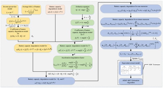 This section focuses on the prediction method of the maximum available capacity and the process of establishing the capacity degradation model. After comparative analysis, the capacity degradation model under dynamic conditions is selected to realize the updating of the available capacity. If accumulative error can be reduced, the prediction accuracy can be improved. Furthermore, the real-time capacity prediction can be added to the AEKF algorithm to improve the robustness of the SOC estimation effectively. The flow chart of the SOC estimation algorithm based on updating the battery capacity is shown in Figure 4.