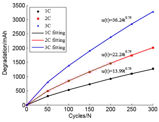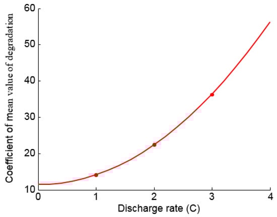 From Equation (26), the degradation equation of battery modules at different discharge rates is obtained, as shown in Equation (28).