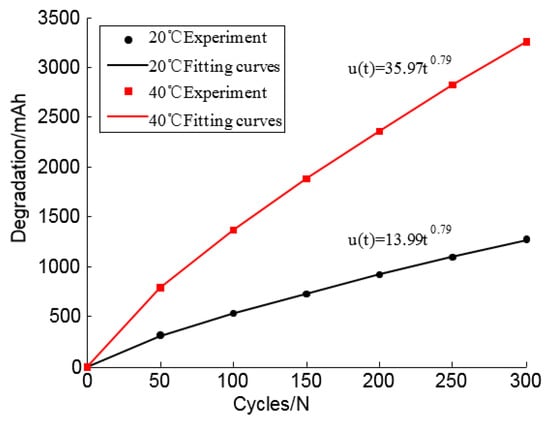 The capacity degradation of the battery at different temperatures and different charging and discharging rates is shown in Table 1. The fitting results of the capacity degradation during 300 cycles under different temperature stresses are shown in Figure 5.