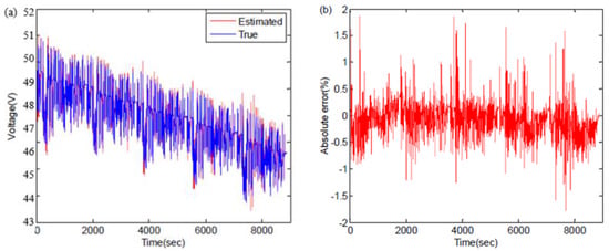 To verify the accuracy of the proposed model, the LIB experiment was carried out. The LIBs were placed in a 25 °C environment, loaded with UDDS cycles. From Figure 9, we can see that the maximum absolute error (MAE) between the estimated terminal voltage and the reference value was less than 2%, which can explain the high accuracy of voltage prediction. Thus, the accuracy of the identification of battery model parameters was increased.