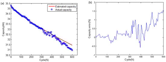 The battery capacity prediction result: (a) capacity prediction; (b) error of capacity prediction.