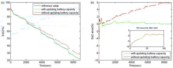 Figure 11 presents the result of SOC estimation in two states, and it shows that the absolute error of SOC estimation increases to about 6% if the capacity is not updated. After updating the capacity, the estimation error of SOC can be stabilized at about 0.5%. Therefore, it is necessary to incorporate the cell capacity degradation model into the repair procedure of the maximum available capacity in SOC estimation. Thus, when the capacity of batteries deteriorates, the capacity C of batteries should be updated in time to ensure the reliability of SOC estimation after battery aging.