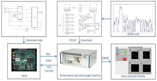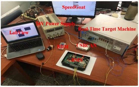 The BMS hardware-in-the-loop (HIL) simulation platform scheme designed in this paper is shown in Figure 12. In this scheme, the battery power in the form of a Simulink model was embedded into the SpeedGoat, a real-time simulation target. BMS communicated with the real-time simulation target machine through the Controller Area Network (CAN). The upper computer display terminal was programmed by LabVIEW, and the parameters were adjusted online and the data collected by Real-time Explorer of MATLAB software. The hardware in the loop simulation platform is shown in Figure 13. The BMS was provided with a 24 V voltage regulated power supply. The battery model was loaded into SpeedGoat by a Simulink compiler. BMS communicated with the simulator directly through CAN bus and was connected with the display terminal of the host computer through a USB-CAN card. The data were monitored in real time in the simulation process. The real-time simulation machine generated the virtual voltage and current as the virtual input of BMS. A background debug mode (BDM) background debugger was able to accomplish two functions including controller C code burning and online simulation debugging. When BMS was running, the registers and variables inside the BMS could be monitored online through the background debugger and online debugging functions of CodeWarrior software.