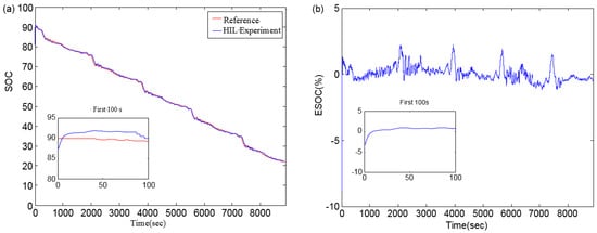 From Figure 14, we can see that the SOC estimation converged to the true value quickly at the beginning of the experiment. The SOC estimation error was less than 3% for the whole experiment. This illustrates that the SOC estimator considering capacity degradation achieves high accuracy. The trend of the SOC estimation curve was the same as that of the reference curve, but over time, the SOC estimation in the HIL test began to lag behind the reference value. We found that the SOC estimation was affected by the operation rate of the single-chip microcomputer, the acquisition rate of voltage and current and the data transmission rate. Therefore, when estimating the SOC of the battery, the capacity of the battery should be updated in real time when the battery capacity declines. At the same time, online parameter identification is necessary to ensure the accuracy of estimation.