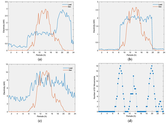 Case study profiles: (a) Households, (b) commercial, (c) industrial and (d) EV movements.