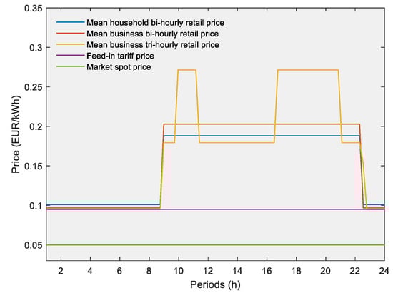 As can be seen by Figure 3, two different types of tariff were used for households and business. Within the business tariffs, two variants were available, namely the bihourly with two different prices and trihourly with three different prices. For households, only a bihourly option was used. In Figure 3, the mean values are depicted (for the bihourly and trihourly tariff). The tariffs slightly changed and varied depending on the contracted power level for each prosumer. For the grid export price, a linear tariff was applied, namely 0.095 EUR/kWh, and for the spot price, 0.050 EUR/kWh (average of MIBEL Setepmber 2020). Table 2 presents the input parameters used in the optimization model. Most of the parameters have a range, e.g., the retail price for prosumers. In this case, the prices could take the minimum value of 0.094 EUR/kWh to a maximum of 0.294 EUR/kWh depending on the contracted tariff and the period of the day.