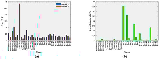 Figure 4a presents the cost comparison for scenario 1 and 2. A small difference can be found within the results of both scenarios. The industrial prosumer presented the higher operational costs at EUR 14.19, the household prosumer group had a mean of EUR 2.79 and the EV group had a mean of EUR 1.72. The total cost reduction for each player, considering the comparison of both scenarios, is presented in Figure 4b. The reduction was more visible in EV players, with a mean cost reduction of EUR 0.055, while for the prosumers, a mean cost reduction of EUR 0.003 was verified. Within the EV group, EV 1 presented the highest reduction at EUR 0.35. Figure 5 presents the electricity export to the grid and P2V transactions between prosumers and EV.