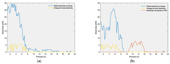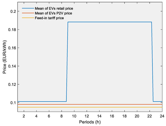 Figure 7 presents the EV charging profiles for scenarios 1 and 2. The EV charging profile corresponds to the aggregation of EV power consumption curves. Figure 7a presents the EV charges from the grid and at home, and in the case of Figure 7b, the P2V transactions are included. In both scenarios, the EVs presented an equal amount of charge charges (204.74 kWh). In Figure 7b, the P2V transaction occurred between 10.30–16.00 h. As can be seen in Figure 2a–c, these periods represent the highest PV generation periods. Some of the electricity bought to the grid in scenario 1 between periods 1.00–4.00 h was moved to periods 10.30–16.00 h in scenario 2, since it moved to the P2V market during the day to profit from local PV generation. Figure 8 presents the final electricity price options for EVs.