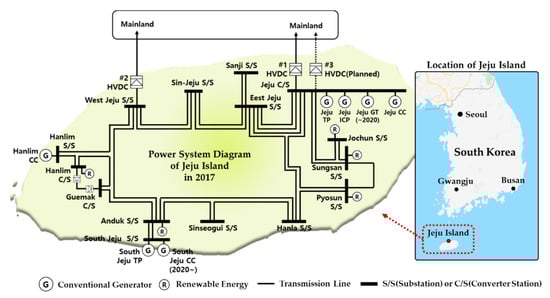 The integration of distributed energy resources (DERs) into the Jeju power grid is an essential part of one of the detailed CFI plans and Jeju Special Self-Governing Province aims to replace conventional generators with VRE such as wind and solar power for up to 70% of power generation by 2030 [5]. Figure 1 shows the power system diagram of Jeju Island in 2017 and the location of Jeju Island in South Korea [24].
