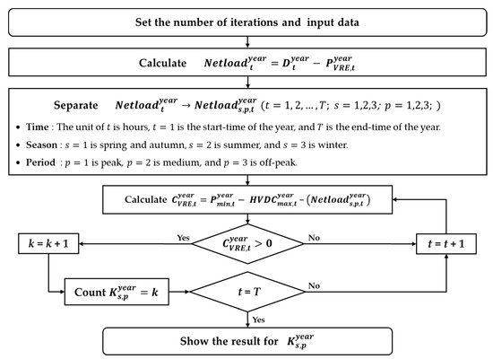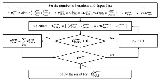 where is the total VRE curtailment for the year and is calculated only when the value of is a positive number. The total VRE curtailment for each year can be calculated as the sum of the values of for the year. Figure 2 shows a flowchart that estimates the amount of VRE curtailment based on the systematic procedure of calculating the VRE curtailment of the islanded power systems for the entire year.