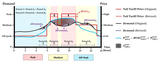 Reference [18] attempted to estimate the electricity demand function and obtain quantitative values on the price elasticity of the electricity demand to derive long-run and short-run elasticities using the time-series data from 1991 to 2014 in South Korea. The short-run price elasticity of the electricity demand is estimated to be −0.142 and the long-run price elasticity of the electricity demand is calculated to be −0.210. Since the price elasticity is considered from a long-term perspective, the value of long-run price elasticity was taken from reference [18] in this study. A conceptual illustration of the ability of the revised ToU tariffs to mitigate the VRE curtailment is shown in Figure 4 below.