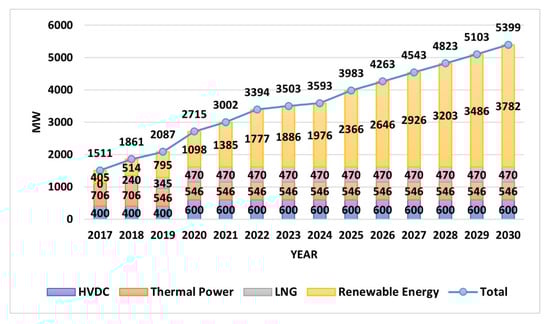 The main dataset is the hourly supply and demand breakdown for Jeju from 2015 to 2017 obtained from KPX and KEPCO. The data used in this study are composed of all the demand and power generation sources for each hour. It is hypothesized that VRE curtailment will rapidly worsen as penetration of VRE continues to augment in line with the Jeju CFI 2030 plan, unless appropriate actions to mitigate the VRE curtailment are introduced in the Jeju power system. Figure 5 shows the projected installed capacity for Jeju until 2030 [21].