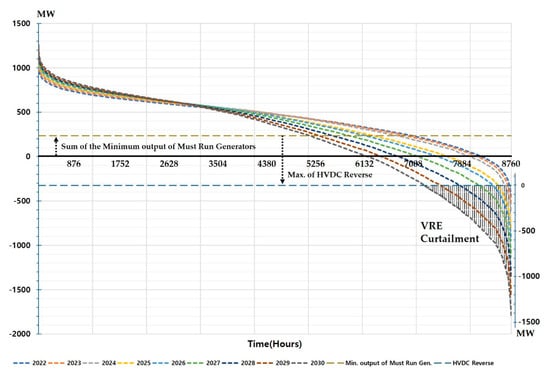 To determine the net load of a specific year in islanded power systems, we combined the values of the power demand with values of the seasonal VRE generation provided by KPX. The numerical result analysis shows the amount of total generation, the amount of VRE generation, and the amount of VRE curtailment each year. It also shows the VRE curtailment time and the VRE curtailment rate. The rate of VRE curtailment is expected to exceed 1% of the annual VRE generation from 2025. In 2030, the rate of VRE curtailment is expected to exceed approximately 10%. Figure 6 and Table 8 show the estimation of VRE curtailment results.