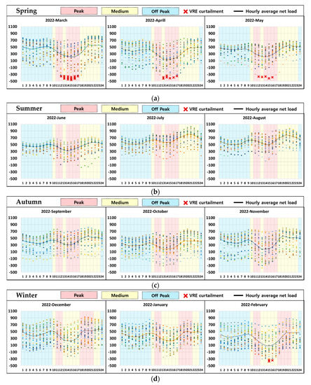 Estimated seasonal monthly net load curve in Jeju 2022: (a) spring; (b) summer; (c) autumn; (d) winter.