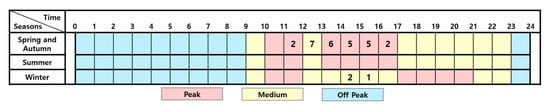 In particular, ToU tariff rates by season and hour involve charging higher rates for peak seasons/hours and lower rates for off-peak seasons/hours. Higher rates are applied in the summer and winter and at peak hours. In spring and autumn, the subpeak and off-peak hours are subjected to lower tariff rates. The price differential in ToU tariffs gives customers an incentive to shift their electricity consumption to lower-priced hours, providing bill saving opportunities, and an associated potential reduction in overall power system costs. Table 4 summarizes the time range for the current seasonal ToU tariff in South Korea [26].
