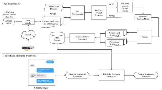 The Amazon Standard Identification Number (ASIN) is obtained from the J. McAuley Amazon product datasets [,] in the building dataset phase. ASIN is a special identification number composed of ten characters that can be used on the Amazon website to identify items using letters or numbers. With 24 product categories in the J. McAuley Amazon product datasets, a web crawler is used to grab APRR from the Amazon website. Furthermore, we also collect datasets for the IMDB review [] consisting of movie reviews with labels. Then, both IMDB and APRR datasets go through text preprocessing and enter into the learning Doc2Vec model [], which transforms a document into a vector. Next, in the Sentiment Analysis (SA) model, logistic regression is trained by using IMDB reviews, and the SA model tags positive or negative views on APRR. As 24 product categories are processed separately, 24 Doc2Vec models and SA models are generated during training. A rule must then be used to filter the APRR tagged by the SA models, i.e., either the product rating of a negative-tagged review must be less than 4, or the product rating of a positive-tagged review must be more than 3. Here we retain the consistent product reviews, and the cosine similarity is used with each negative review to find the highest-similarity positive review. Finally, the NPSS datasets are used to train the STM, where negative–positive pairs of reviews are gathered.
