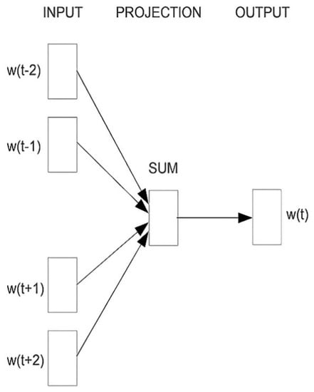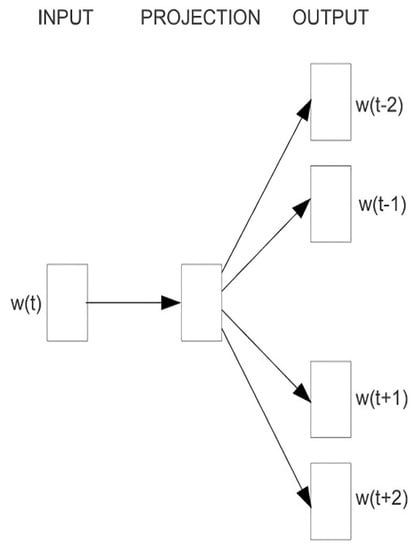 The Skip-Gram architecture is similar to CBOW and consists of input, projection, and output layers. However, Skip-Gram uses a word to predict the contexts; in other words, the input layer’s input is only the current word, and the target is the surrounding words of the current word, as shown in Figure 3.