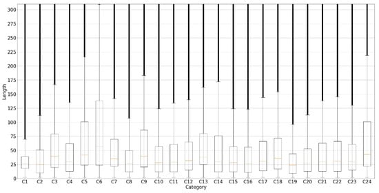 A rule must be used to filter the APRR which are tagged by the SA models, i.e., either the product rating of a negative-tagged review must be less than 4, or the product rating of a positive-tagged review must be more than 3. Here we retain the consistent product reviews. Generally, product reviews of grades 4 and 5 are considered positive, and product reviews of grades 1 and 2 are considered negative. Since negative reviews are far smaller than positive reviews, as seen in Table 1, we treat neutral reviews (with rating 3) as negative reviews. Moreover, using boxplots as shown in Figure 6, we calculate the dispersion of review lengths in 24 categories.