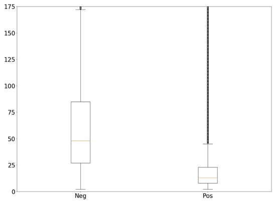 Finally, the NPSS datasets are used to train the STM. In total, from approximately 110 million APRR in 24 categories, we produced over 6 million negative–positive pairs of sentimental statements with resembling semantics. Moreover, using boxplots as shown in Figure 7, we calculate the dispersal of the number of tokens for negative–positive sentimental statements.