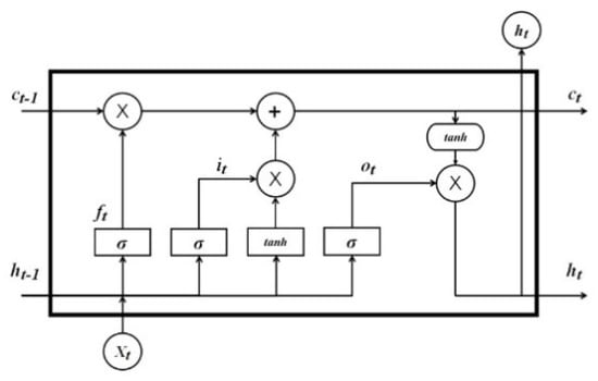 Generally, LSTM can improve the drawback of RNN during training, especially when long sentences are trained. The terms preceding a current word may be ignored for a long paragraph or sentence, allowing the gradient issue to disappear. Several approaches, such as the gradient clipping proposed by Pascanu et al. [] and using more sophisticated LSTM or GRU neurons, have been proposed to solve this problem. LSTM is used in this paper to interpret sentimental statements in which, compared to RNN, three additional gates (i.e., input, forget, and output gates) are applied to LSTM as shown in Figure 8. These gates are responsible for monitoring previously hidden states, current inputs, and other data that decide what information is discarded or kept.