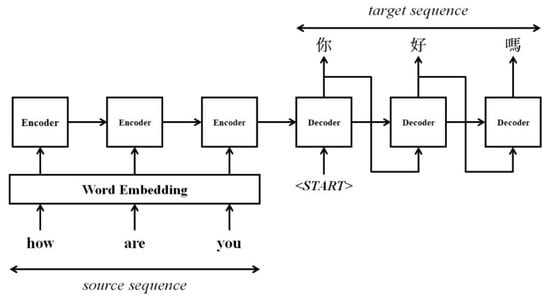 Seq2seq has been a prevailing model of sequence generation in recent years. Selecting appropriate encoders and decoders is an important step in the end-to-end learning applications. The encoders and decoders can consist of RNN, LSTM, or GRU. The Seq2seq model is given a source sequence and a target sequence, as shown in Figure 9. The source sequence is mapped to the source sequence’s tokens in a continuous vector space of fixed dimension by word embedding. The source sequence is then encoded in the encoders and decoded into the target sequence as output in the decoders. For the source sentence “how are you” in the English–Chinese translation model, it enters the encoders via word embedding and is decoded into “你好嗎” when the decoding instruction is received.