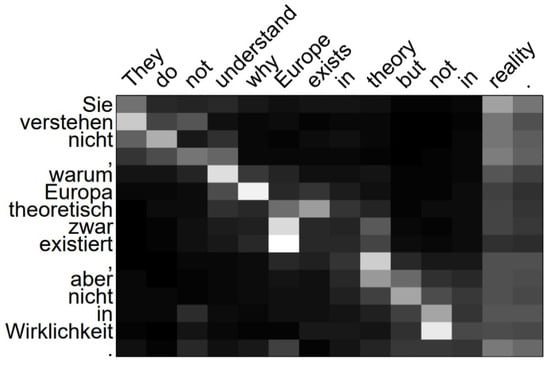 The visualization of the English to German translation attention process, as shown in Figure 10, was provided by Luong et al. []. The attention mechanism in the translation pays more attention to words with higher weights to produce sequences. White blocks in the diagram imply higher weights, and black blocks imply lower weights. Here, in the Seq2seq model, we also apply the attention mechanism to produce better PSSs.