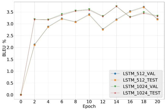 BLEU is a text evaluation algorithm originally used to evaluate the correspondence between machine translation and professional human translation. In general, the closer the machine translation is to the professional human translation, the better the machine translation. Thus, the BLEU algorithm’s score can be used as an indicator of STM quality. The higher the BLEU scores, the higher the word similarity to the target sentences. Here, the BLEU scores do not consider grammar correctness, statement polarity (i.e., positive and negative), and sentence semantic similarity. At present, BLEU scores are not only used in machine translation [] but also used in image caption [,,], conversational agents [], etc., to evaluate their models.