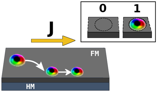 Skyrmion movement inside a plain nanostrip in response to a current flow. In the inset, the encoding of binary information with skyrmions.