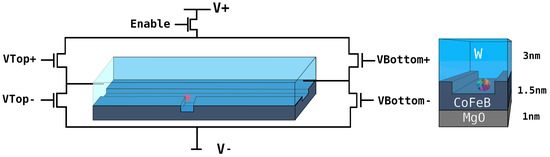 The basic cells of memory array were simulated using a GPU accelerated micromagnetic simulation software, Mumax [28,29]. The simulation discretization is set to 1 × 1 × 0.5 nm3. The material parameters used in the micromagnetic simulation are reported in Table 1. Micromagnetic simulations, as the one showed in Figure 4, were used to verify the correct behavior of the designed circuit and to estimate the current density needed to accomplish every operation.
