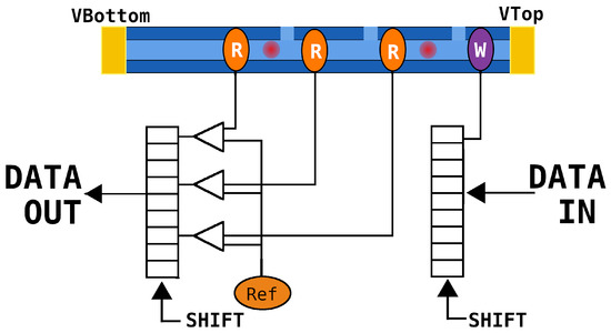 To write the information inside the memory every new bit, nucleated at the write head, is shifted along the racetrack. After a complete write operation, the bits of the word are stored in precise portions of the track. To read the information stored in the track, the skyrmions need to reach a read head. The skyrmions are pushed with a short current pulse and then shifted in the direction of read head. Here, every skyrmion is sensed as a variation in the resistance of a magnetic tunnel junction in which the ferromagnet, hosting the skyrmion, corresponds to the free layer of the reading device [25]. As shown in Figure 5, the value is compared with a reference resistance. With a single read head on the track, the required latency for a read operation is equal to . In order to reduce the latency for a complete read operation more read heads are placed on the track, as shown in Figure 5, allowing the read of multiple bits at every memory cycle. After the read operation the word needs to be shifted back in the original position in order to be ready for computation.