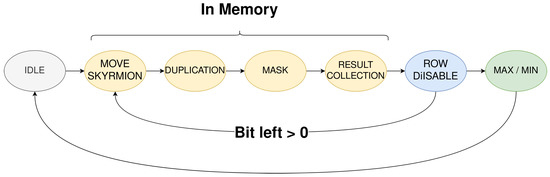The search of a maximum/minimum starts when the signal FIND is activated. The mask is loaded by the MASK GENERATOR block and the processing of the word stored starts from the MSB selected by the ROW DECODER. The FSM now goes through five steps to process the information stored in memory as shown in Figure 7. The first four are executed inside the memory array in which the information stored in the cell is processed as explained in Section 3.1. When the selected bit has been processed, the results are collected by the reading unit. In the fifth step, the result of evaluation is used to select the words that will continue in the evaluation. The TRACK DISABLE based on the reading results generates the signals to the TRACK decoder which tracks what will be disabled in the next cycles. At every new repetition of the four cycle, the mask is shifted by one position. The elaboration in the memory array and the evaluation of the results is repeated for times. After the last evaluation, the output of the TRACK DISABLE block indicates the position of the maximum. The FSM moves into the ENCODER state. The signal of track disable is translated by the ENCODER block in the output address. Finally the FSM returns in IDLE state.