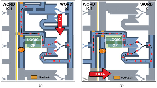 The modified memory array is based on the model of a racetrack memory. In the memory array, every word is memorized in a different nanotrack. As shown in Figure 5, a write head is present at the beginning of the nanotrack to nucleate the skyrmion. At least one read head is present along the track. Words are written and read sequentially in every racetrack.